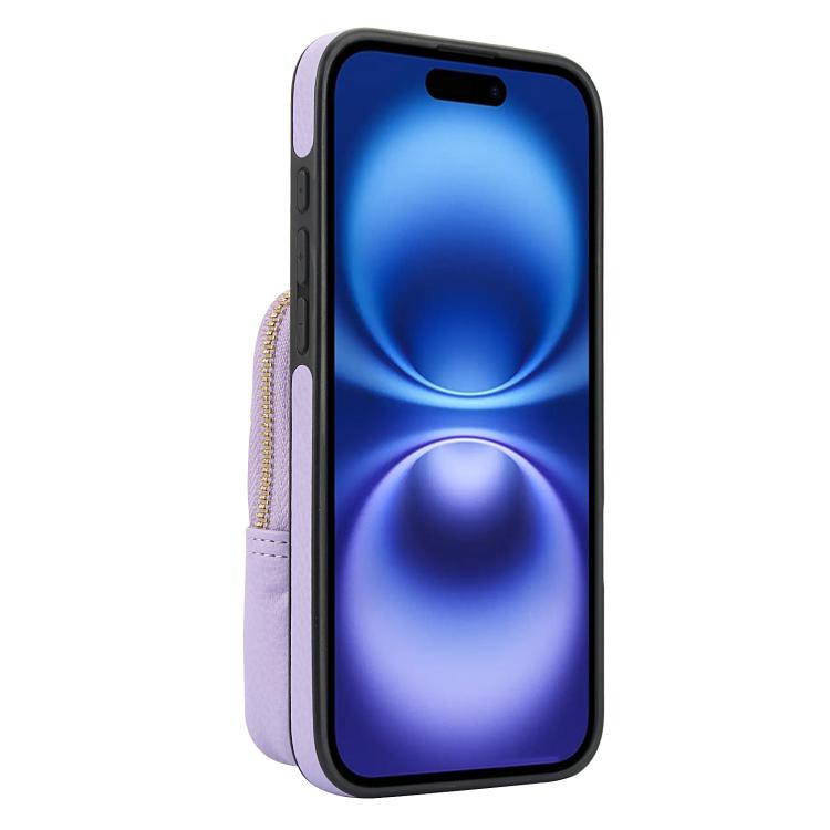 Funda para iPhone 16 Awquer con Cremallera y Bandolera de Piel de Lichi (Morado Claro)
