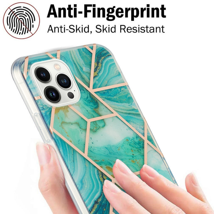 Funda para iPhone 16 Pro Diseño Flores Mármol Empalme Galvanizado Doble Cara Imd TPU Azul