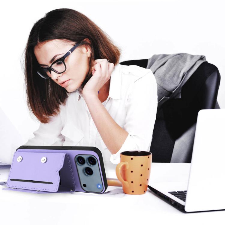 Funda para iPhone 17 Pro Max con cuatro ranuras para tarjetas y correa para la muñeca (morado)