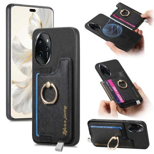 Funda para Teléfono Honor 100 Pro con Tarjetero y Anillo de Cuero Retro Magsafe (Negro)