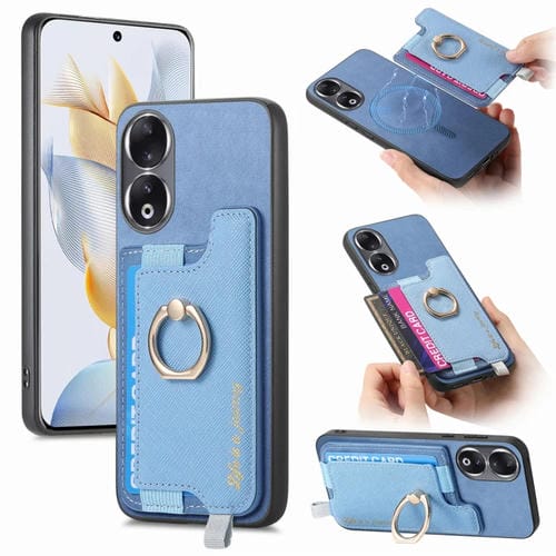Funda para Teléfono Honor 90 Pro 5G con Tarjetero y Anillo de Cuero Retro Magsafe (Azul)