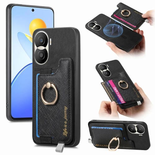 Funda para Teléfono Honor Play 7T/X7A con Tarjetero y Anillo de Cuero Retro Magsafe (Negro)