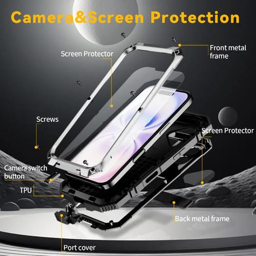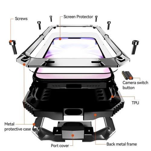 Funda R-JUST de metal, silicona y vidrio templado para iPhone 17, resistente al agua y con soporte (plateada)