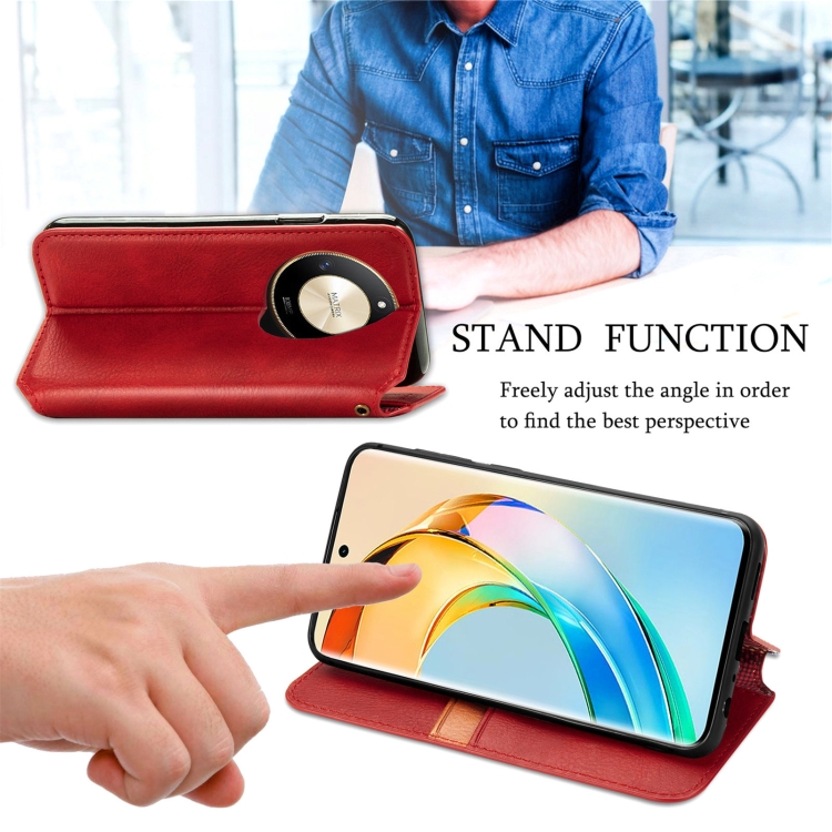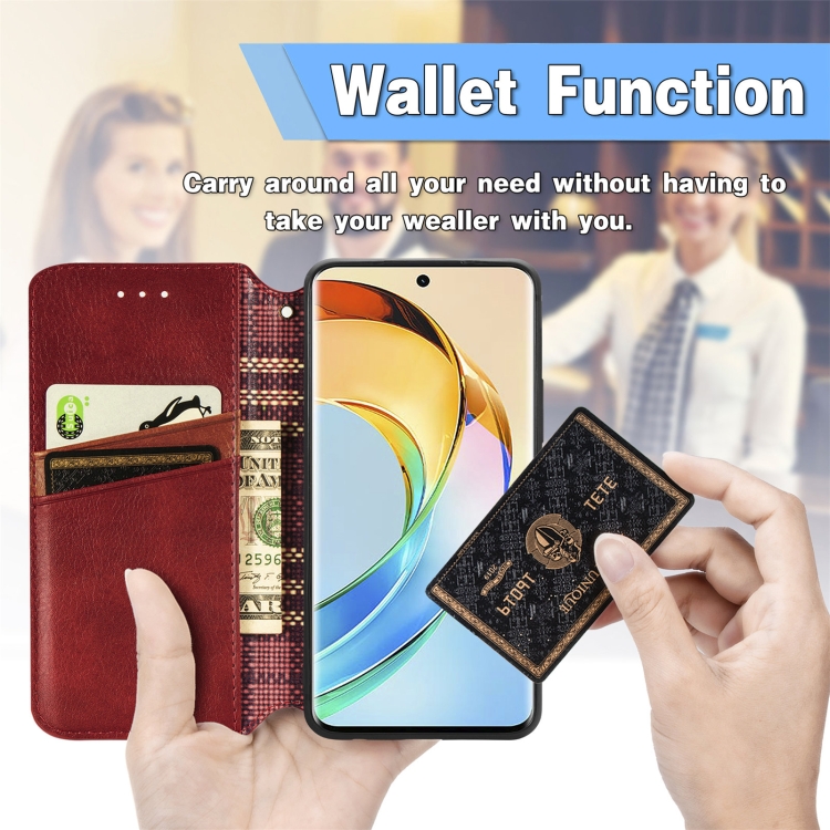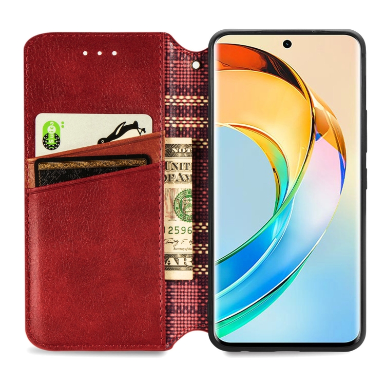 Funda para Honor X50 Cubic Grid de Cuero Magnético Prensado (Rojo)