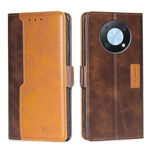 Para Huawei nova Y90 4G Caja de teléfono de cuero con hebilla lateral de color de contraste (marrón oscuro + dorado)