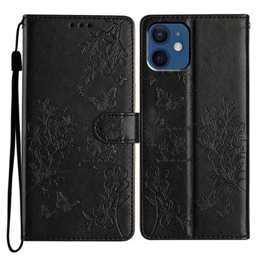Funda para Teléfono iPhone 12/12 Pro Cuero Relieve Flor de Amor y Mariposa (Negro)