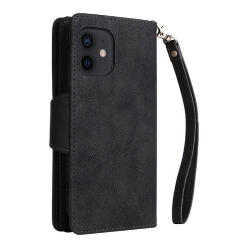 Funda de cuero para iPhone 12 Mini Rivet Buckle con 9 Tarjetas y triple pliegue (Negro)