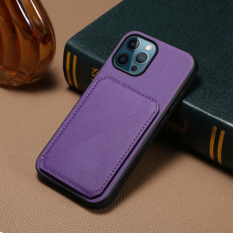 Funda para teléfono iPhone 12 Pro Max D04 con soporte y ranura para tarjeta dual (Púrpura)