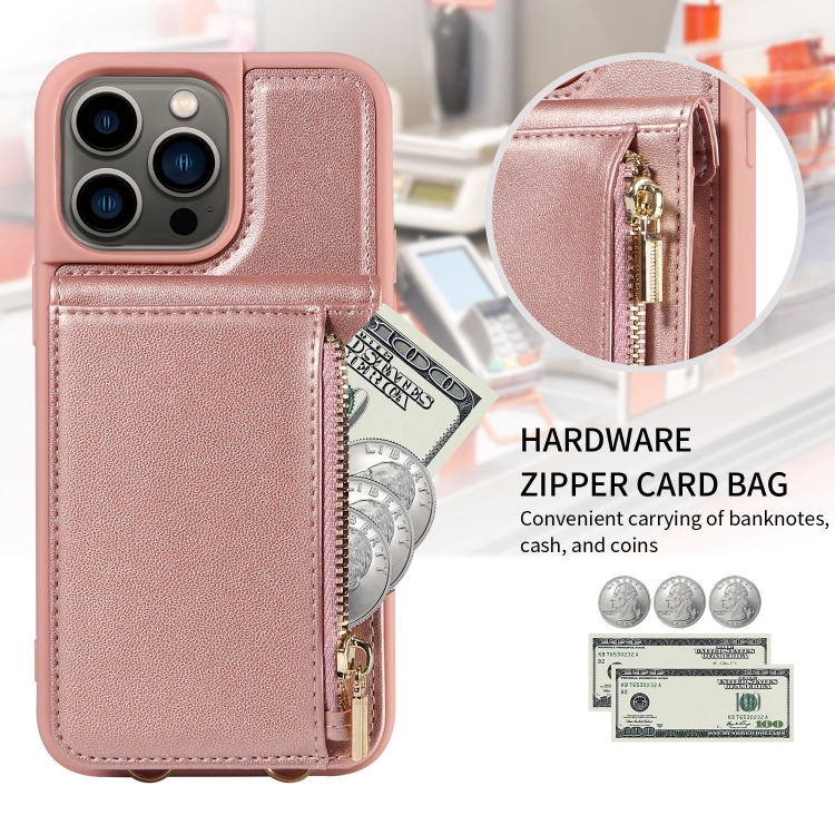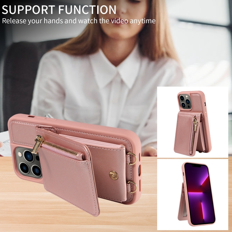 Funda de Cuero Crossbody Lanyard Zipper Wallet para iPhone 13 Pro (Oro Rosa)