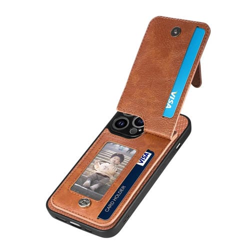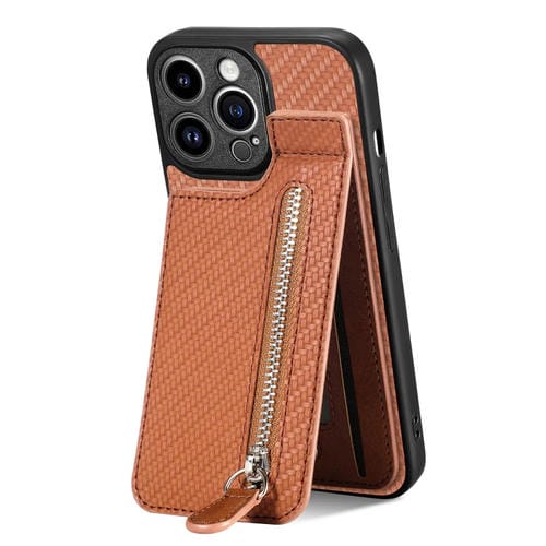 Pour iPhone 13 Pro Max Étui de téléphone à fermeture éclair verticale en fibre de carbone (marron)