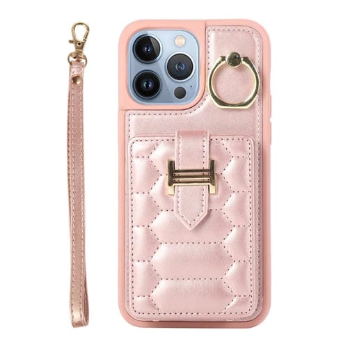 Funda para iPhone 13 Pro Max Vertical Card Bag Ring Holder con Doble Cordón (Oro Rosa)