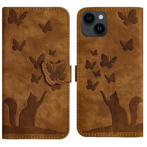 Funda para Teléfono iPhone 14 Cuero con Tapa Estampado Gato Mariposa (Marrón)