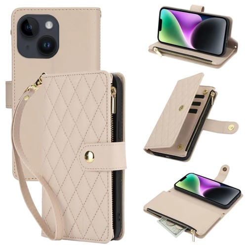 Funda de Cuero para iPhone 14 Plus Ym016 con Billetera, Tarjeta, Cremallera Rómbica y Cordón (Albaricoque)