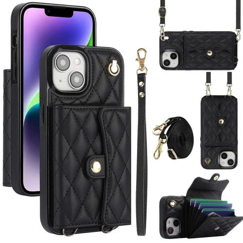 Funda para Teléfono iPhone 15 Cuero con Billetera Horizontal Rombal Cruzada (Negro)