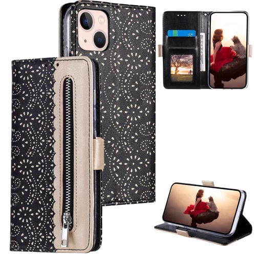 Funda de Cuero para iPhone 15 Patrón de Encaje Botón Doble Cremallera con Cordón (Negro)