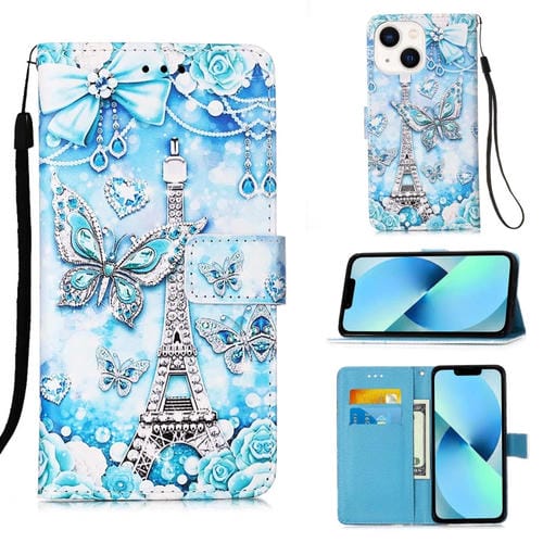 Funda de teléfono iPhone 15 Plus Patrón de Dibujo Coloreado Cuero de Tejido Liso (Mariposa Torre)