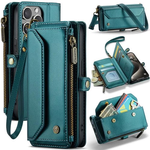 Funda para iPhone 15 Pro Caseme C36 Cartera con Ranuras para Tarjetas y Cremallera Antirrobo Rfid (Azul-Verde)