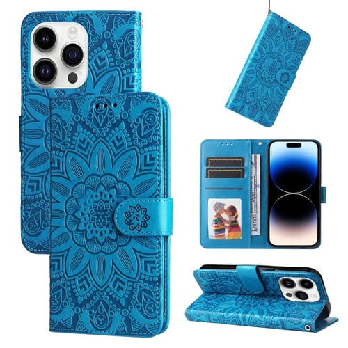 Estuche para teléfono iPhone 15 Pro cuero con estampado de girasol en relieve (Azul)