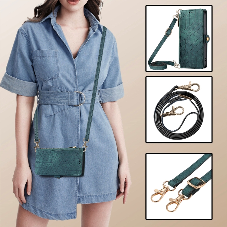 Funda para Teléfono iPhone 15 Pro Max Cuero Hebilla Lateral Billetera Cremallera Geométrica Cordón Cruzado (Verde)