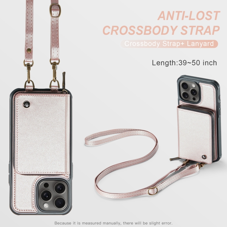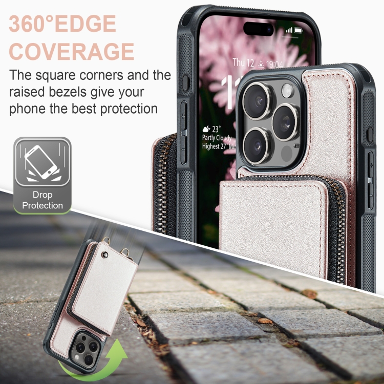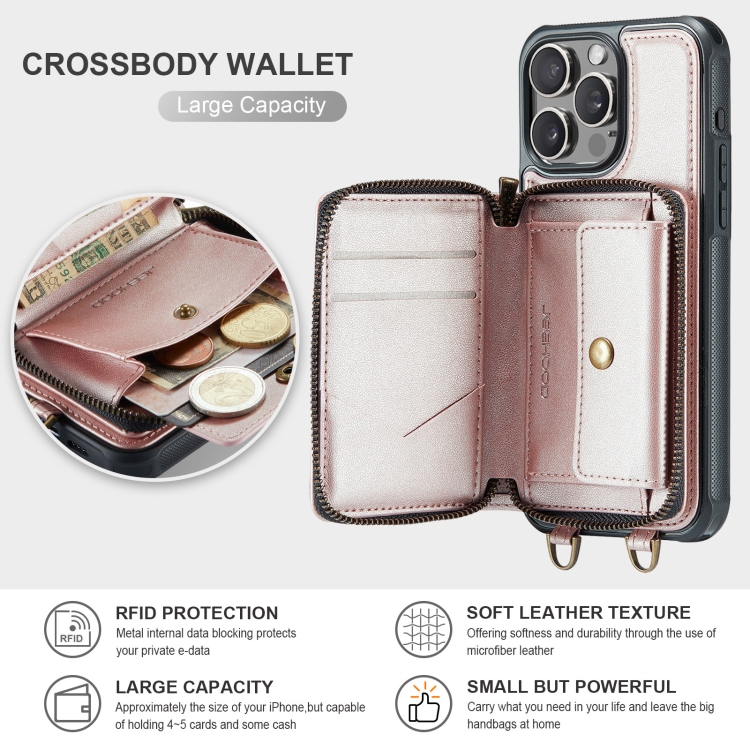 Estuche para Teléfono + Jeehood + C22 Series + Para iPhone 16 Pro Max + Billetera de Cuero con Cremallera y Cordón Doble + (Oro Rosa)