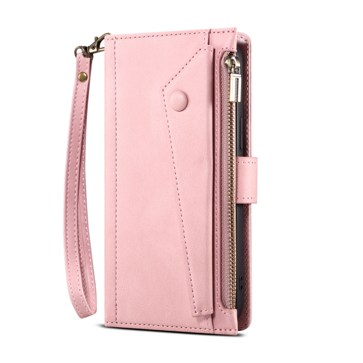Funda de Cuero para iPhone X Xs con Tapa Horizontal Esmerilada Retro Soporte Ranura Tarjeta Billetera Bolsillo Cremallera Cordón (Oro Rosa)