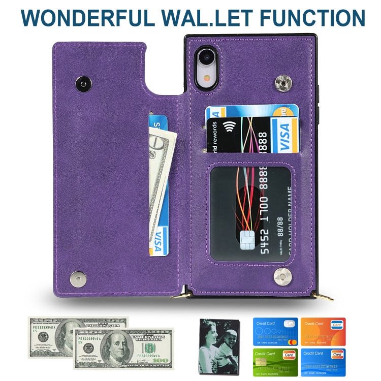 Funda para iPhone Xr Cross-Body Square Doble Hebilla Flip Card Bag TPU + PU con Ranuras para Tarjetas Billetera Foto y Correa (Púrpura)