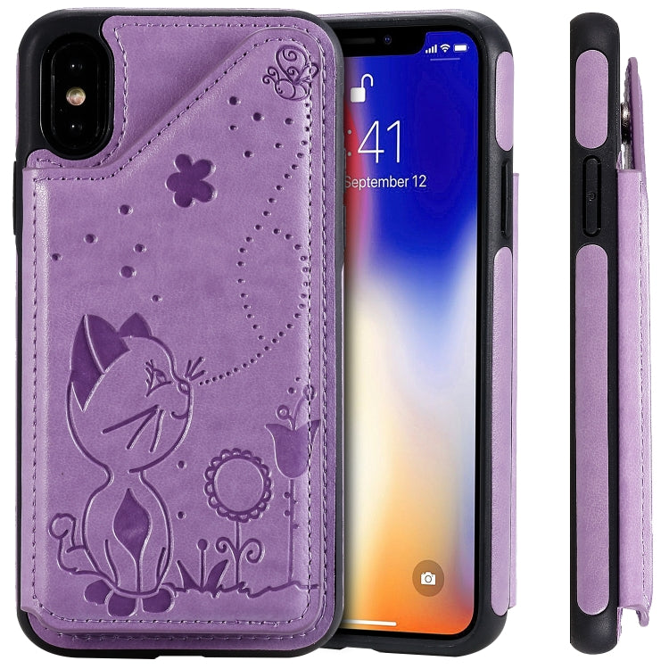 Estuche protector para iPhone Xs Cat Bee patrón en relieve a prueba de golpes con ranuras para tarjetas y marco de fotos (Púrpura)