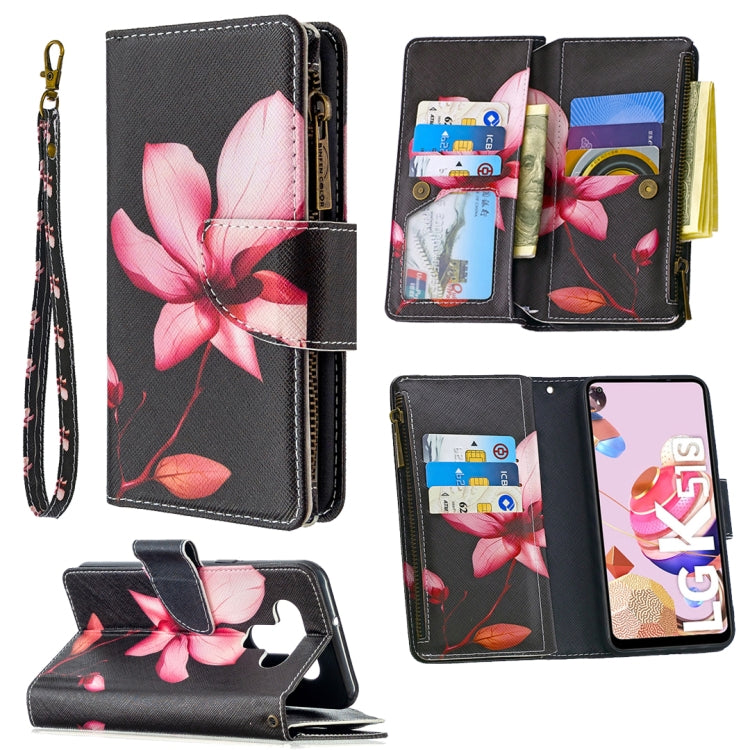 Funda de Cuero para LG K51 con Patrón de Dibujo, Cremallera, Tapa Horizontal, Soporte y Billetera (Lotus)