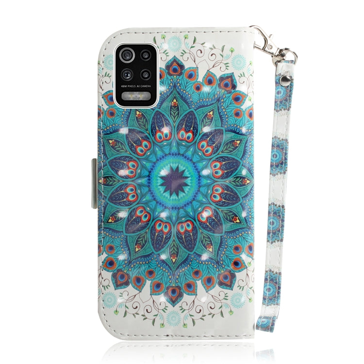 Funda de Cuero Abatible Horizontal para LG Q52 con Dibujo 3D, Soporte, Ranuras y Cordón (Corona de Pavo Real)