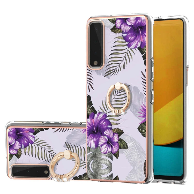 Funda TPU LG Stylo 7 5G Patrón Galvanoplastia a Prueba de Golpes con Soporte Anillo Diamantes (Flor Morada)