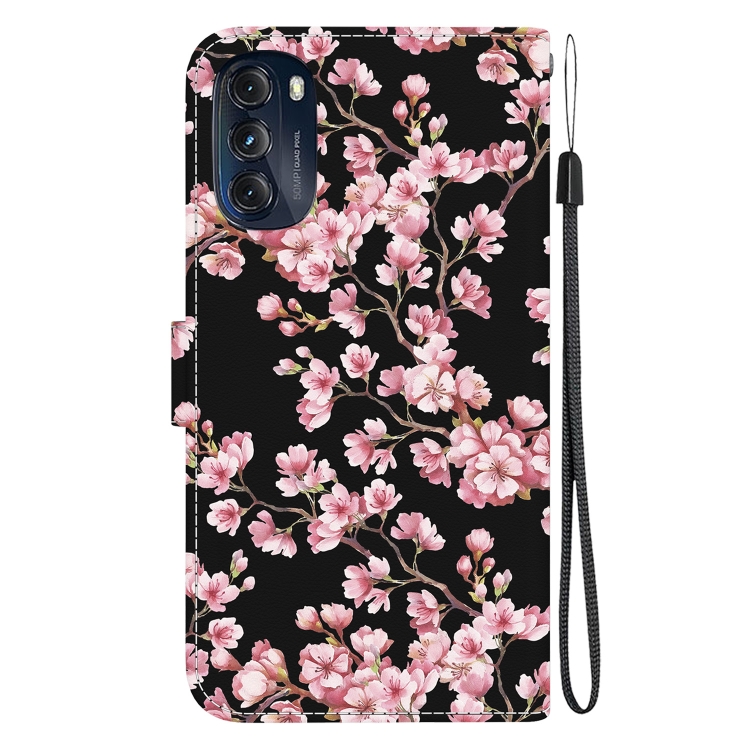 Estuche de Cuero para Motorola Moto G 2022 con Dibujo Coloreado y Textura de Cristal (Flor de Ciruelo)