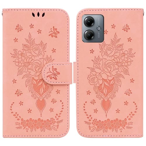 Funda para Motorola Moto G14 de Cuero con Relieve Mariposa y Rosa (Rosa)