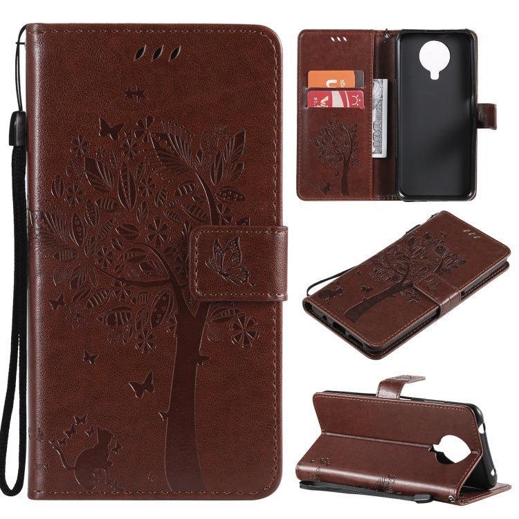 Para Nokia 6.3 Patrón de árbol y gato Impresión prensada Funda de cuero Horizontal Flip PU con soporte y tragamonedas de tarjetas y billetera y cordón (café)