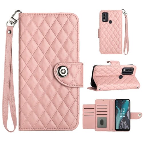 Funda para Nokia C22 de Cuero con Tapa Textura Rómbica y Cordón (Rosa Coral)