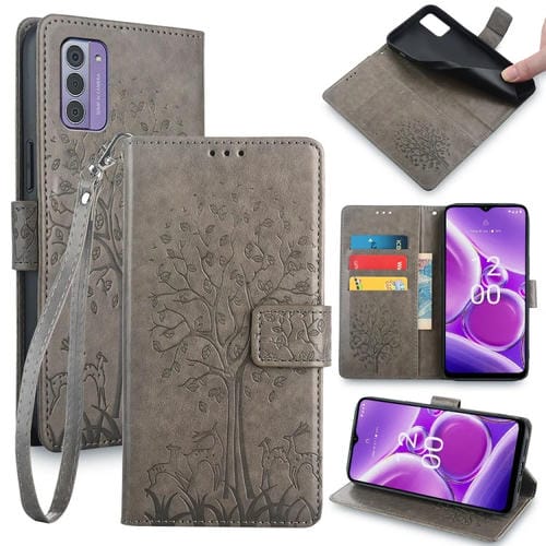 Funda para Nokia G42 5G de Cuero con Relieve de Árbol y Ciervo (Gris)