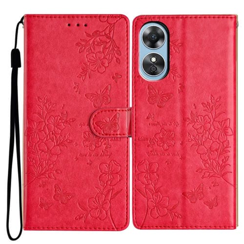 Para Oppo A17 Butterfly Love Flower Funda de Cuero para Teléfono En Relieve (Rojo)