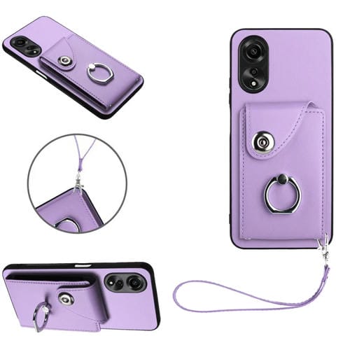 Para Oppo A58 / A58X / A78 5G / A1X / A2X Bolsa para Tarjeta de Órgano Soporte para Anillo Funda para Teléfono Pu con Cordón (Púrpura)