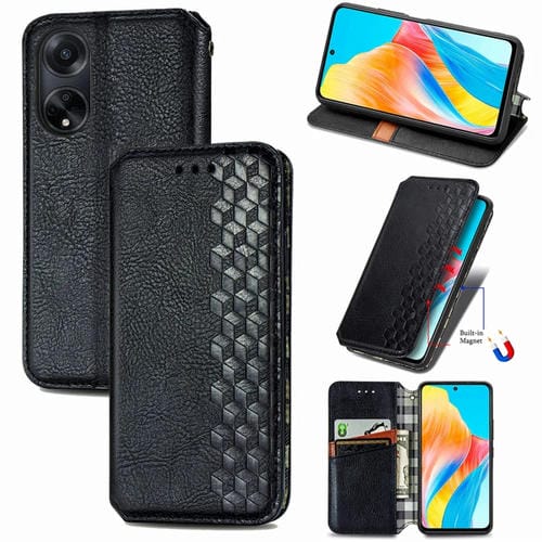 Para Oppo A98 Cubic Grid Funda de Teléfono de Cuero Magnético Prensado (Negro)