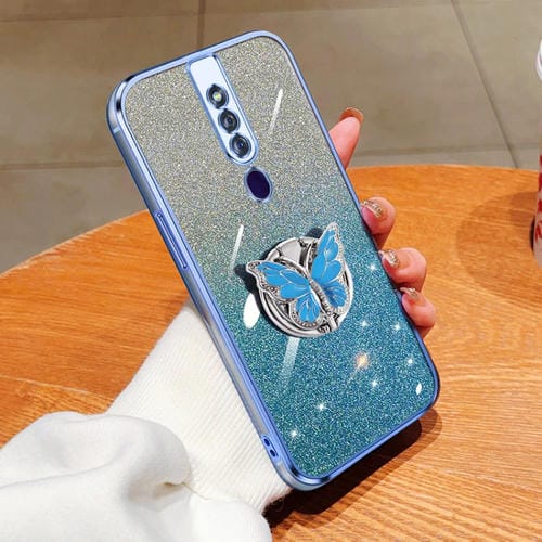 Para Oppo F11 Pro Estuche para Teléfono de TPU con Soporte de Mariposa con Brillo Degradado Plateado (Azul Sierra)