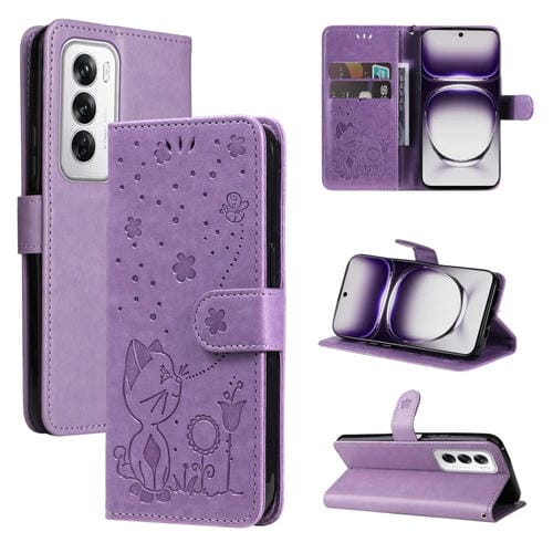 Para Oppo Reno12 5G Global Cat And Bee Funda de Cuero con Tapa En Relieve (Púrpura)