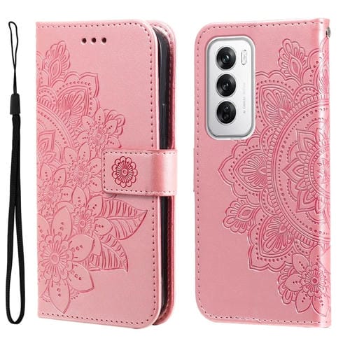 Para Oppo Reno12 5G Global Funda para Teléfono de Cuero con Estampado de Flores de Siete Pétalos (Oro Rosa)