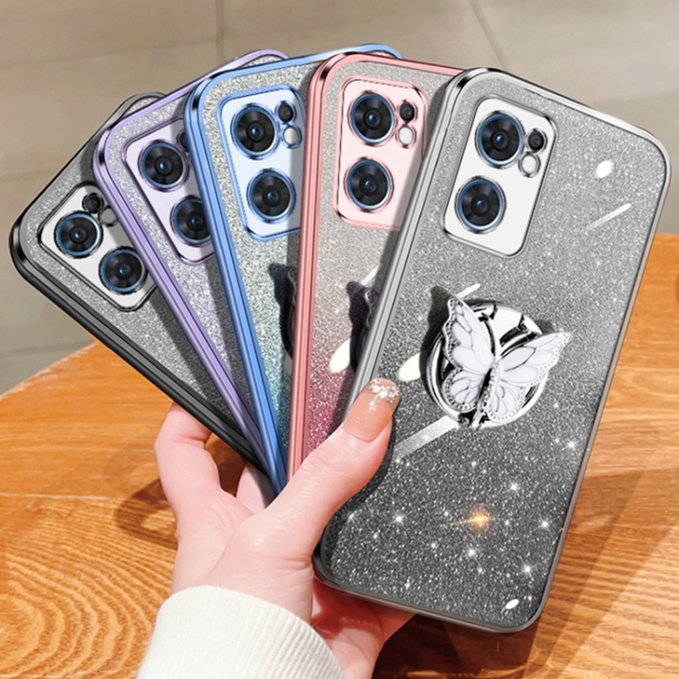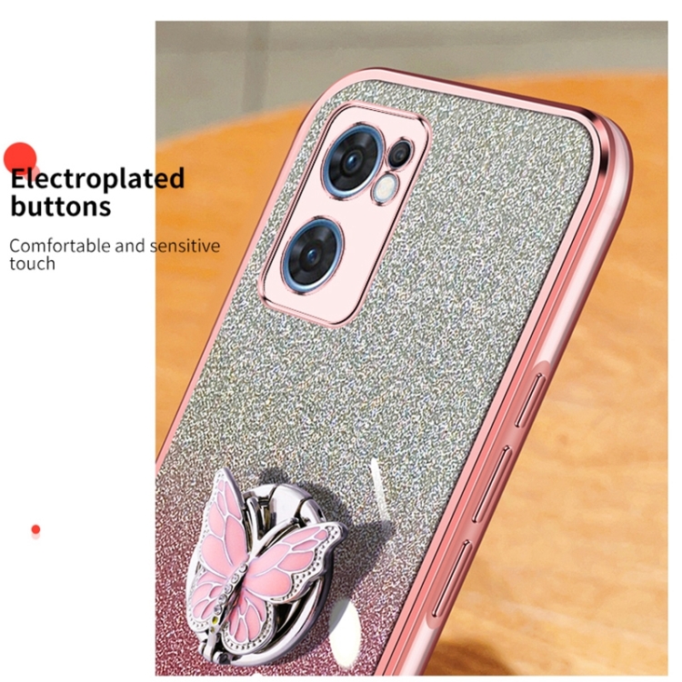 Para Oppo Reno7 5G Estuche para Teléfono de TPU con Soporte de Mariposa con Brillo Degradado Plateado (Rosa)