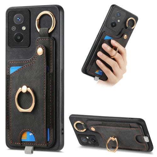 Para Redmi 12C Funda para Teléfono con Bolsa para Tarjeta con Anillo y Sensación de Piel Retro con Lazo para Colgar (Negro)