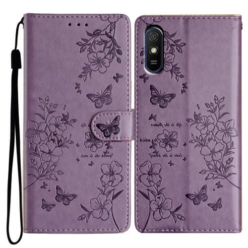 Para Redmi 9A Funda de Cuero para Teléfono con Mariposas y Flores (Púrpura)
