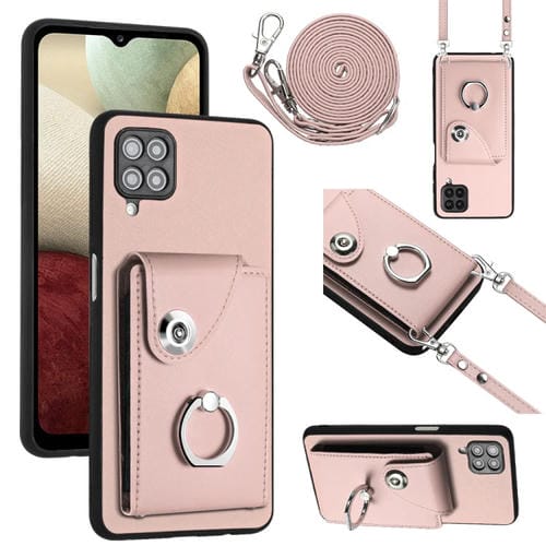 Funda para Teléfono Samsung Galaxy A12 con Soporte para Anillo y Bolsa para Tarjeta con Cordón Largo (Rosa)