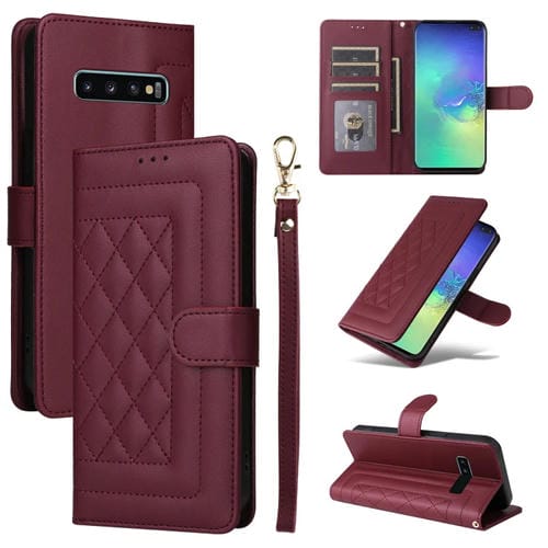 Estuche para teléfono Samsung Galaxy S10 con tapa de cuero Diamond Lattice (Rojo Vino)