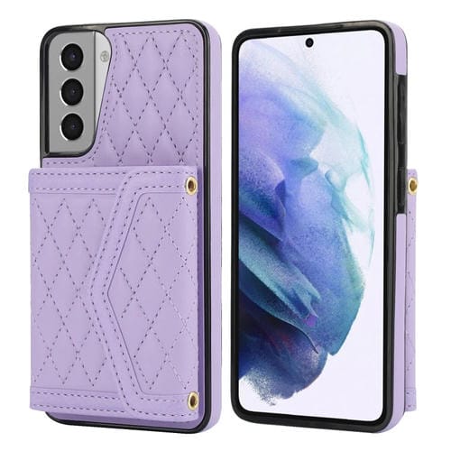 Estuche para Teléfono Samsung Galaxy S21 5G con Bolsa para Tarjetas Textura Rómbica Empalme Cordón Largo (Púrpura)
