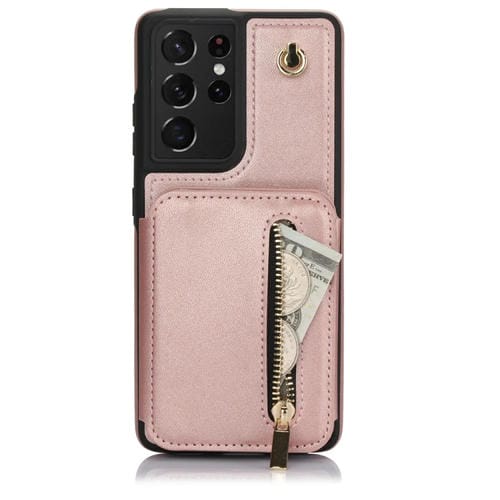 Estuche para teléfono Samsung Galaxy S21 Ultra 5G Ym006 con bolsa para tarjetas con cremallera y sensación de piel con cordón doble (Oro Rosa)