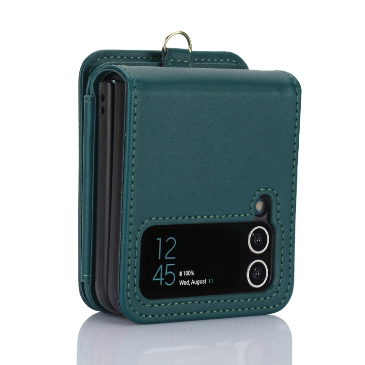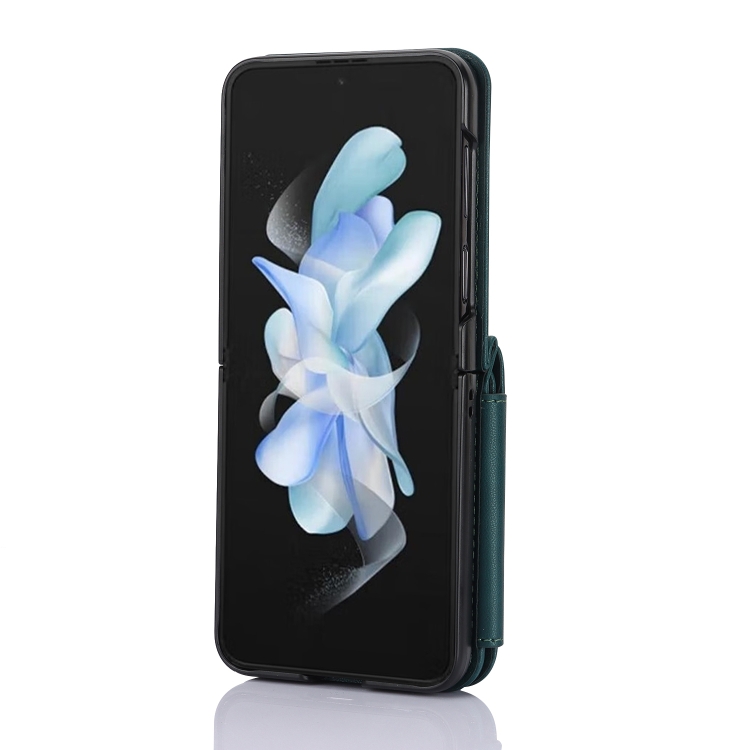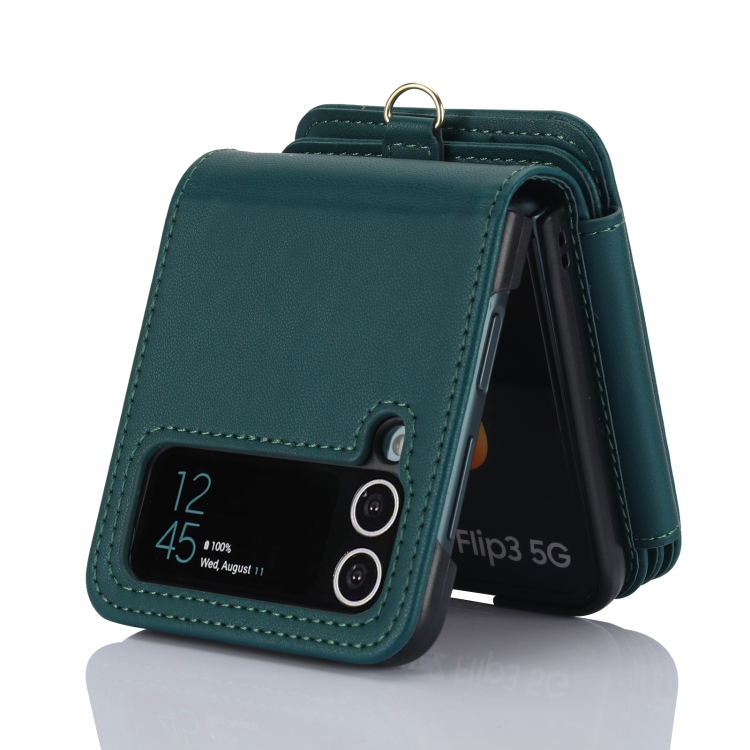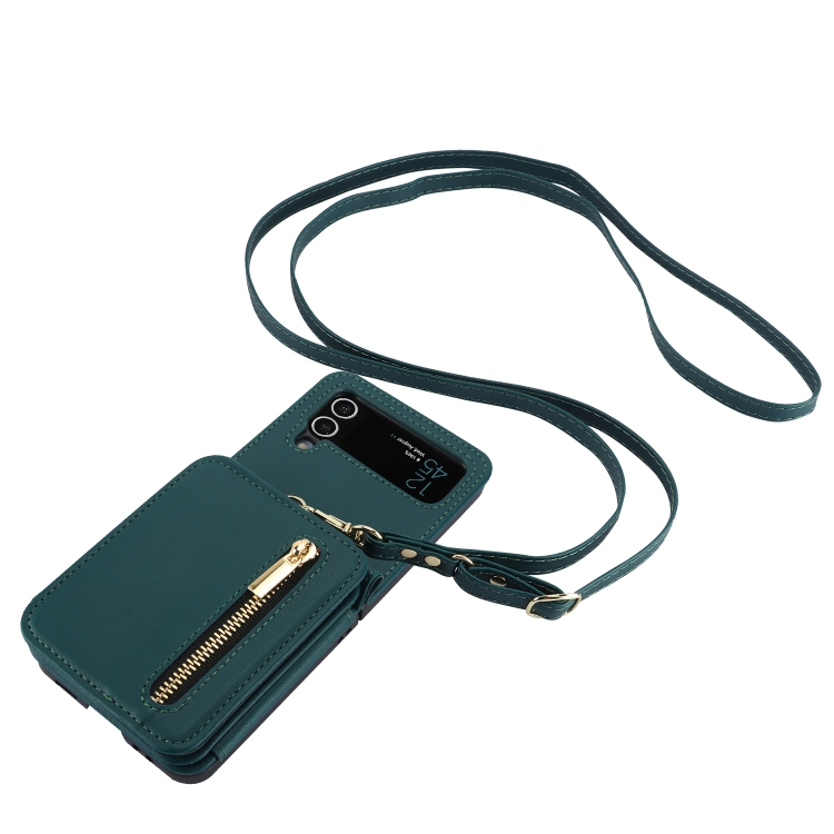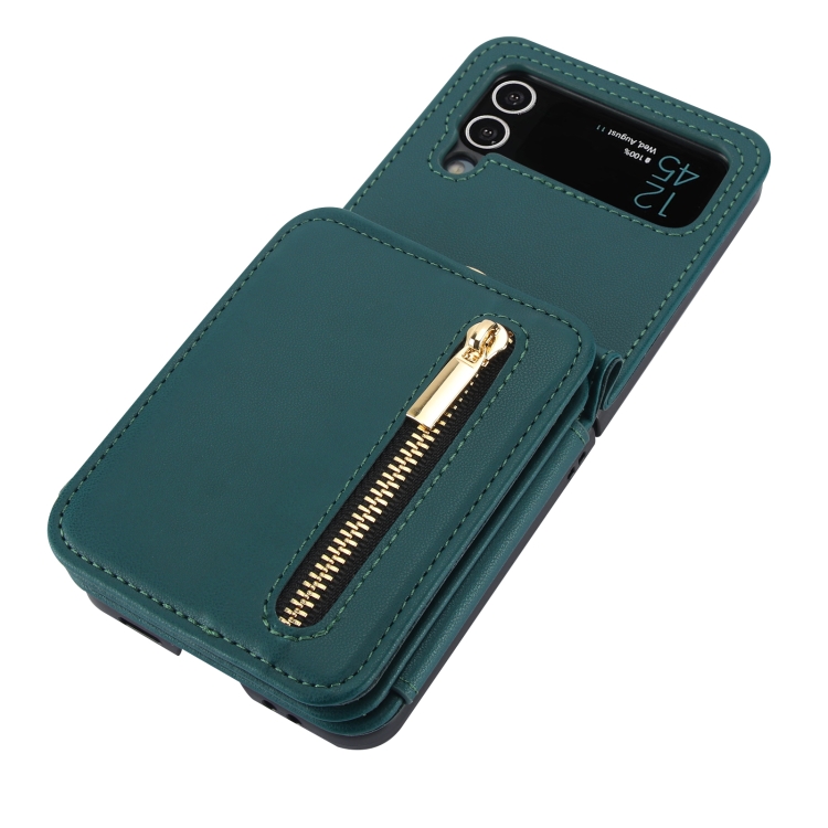 Estuche plegable para teléfono Samsung Galaxy Z Flip3 con ranuras para tarjetas y cremallera con cordón largo (Verde)