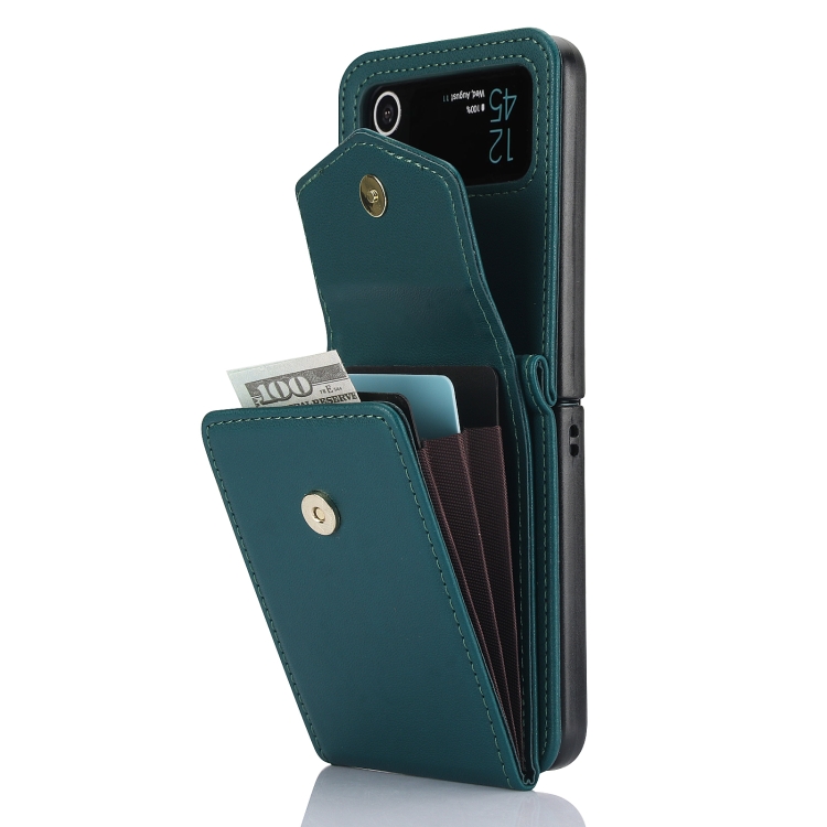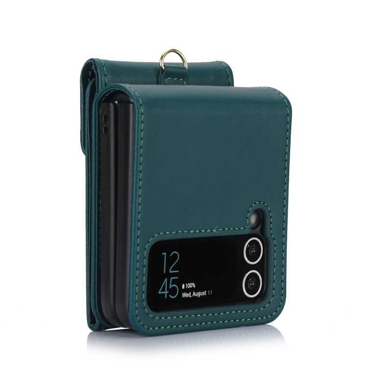 Estuche plegable para Samsung Galaxy Z Flip4 con función RFID, ranuras para tarjetas y cordón largo (Verde)
